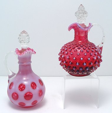 TWO EARLY FENTON CRANBERRY OPALESCENT GLASS CRUETS: Hobnail and Coin Spot. Each with the stopper. No chips or cracks, 7'' and 7 1/2''h.