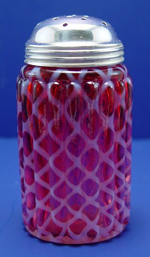 NORTHWOOD CRANBERRY GLASS ''RIB LATTICE'' SUGAR SHAKER: 1 3/8'' dia. 4 3/4''h. No chips or cracks.