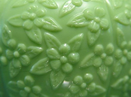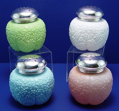 FOUR CHALLINOR MUFFINEERS IN THE FORGET ME NOT PATTERN: One of each color, blue ink, white and green. Ribbed body, screw on tops. Please note roughness along edges under the caps. 3 3/4''h.