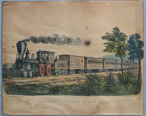 CURRIER AND IVES LITHO ''EXPRESS TRAIN'': 11'' x 13 1/2'', original frame. Condition - Staining throughout, water stains in the margins.