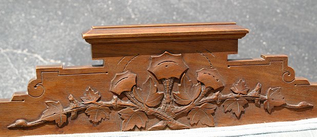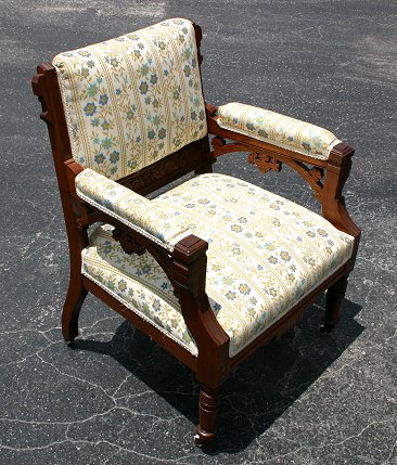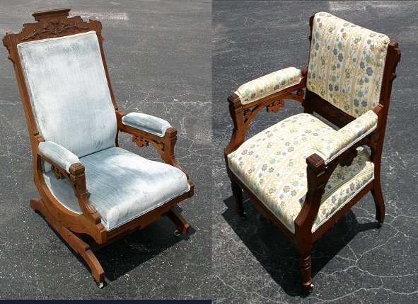 EASTLAKE VICTORIAN PLATFORM ROCKER AND MATCHING OPEN ARM CHAIR: Blue velvet upholstery on rocker with floral carving to upper back, floral upholstery on chair in complimentary color pallet and flowers that match the carving on the rocker. Foliate carving to bottom of back on open arm chair. Both raised on castors, rocker 39''h., chair 33''h. Both in great - ready to go - condition, very tiny spot on left arm of rocker.