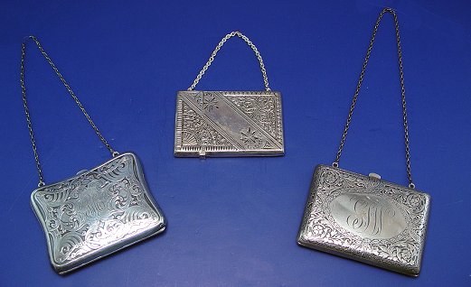3 STERLING CHAIN HANDLE CASES: To include, art nouveau embossed card case, vertical hinged top, marked Sterling on inner edge, chain attached to each part, 3 1/2'' x 2 1/2''; shaped case in art nouveau design, marked Sterling, reversed 2 483, pressure clasp, approx. 3 7/8'' x 3'', monogrammed PEM; and a small sterling purse with embossed art nouveau design, front monogrammed GWF, inside divided into three fabric pockets, slight staining, center pocket closeable with small flip clasp, inner edge marked Sterling, unidentified makers mark and 2904?, 2 3/4'' x 3 3/4''. Three sterling clutch sold as a lot.