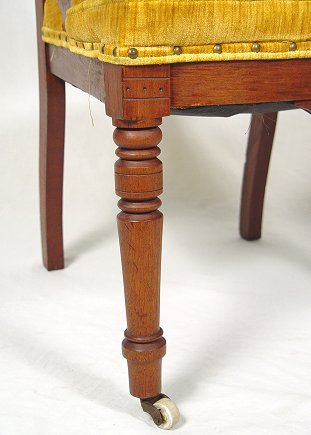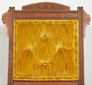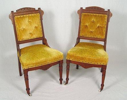 PAIR OF EASTLAKE VICTORIAN SIDE CHAIRS: Nicely carved top rail, gold velvet cushioned seat and back. 35 1/2''h x 19''w x 18''deep.
