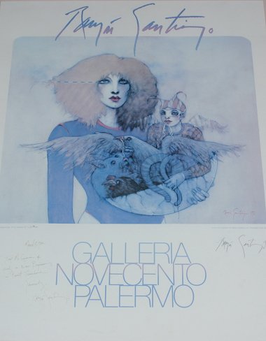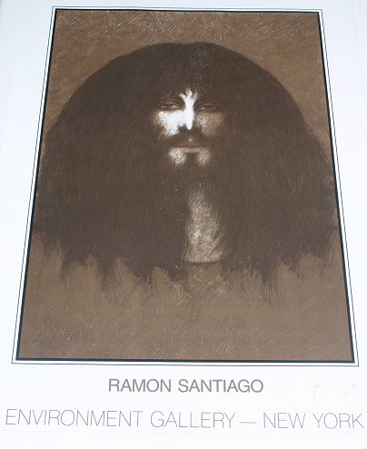 SANTIAGO, Ramon, (American, 20th C.): Pair of Signed Posters, 1) Self Portrait for the Environment Gallery-New York, signed and dated 1982, 38'' x 27 1/2'', wear to black frame, 44'' x 33'', scattered white spots in center of image. 2) ''New Beginnings'', for the Galleria Novecento Palermo, SLR, dated 1982, 31'' x 23 1/2'', chrome frame, 37 1/2'' x 30'', light faded, both pieces are dedicated to Tom McGovern.