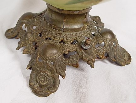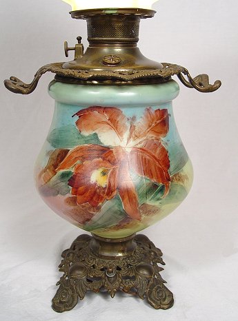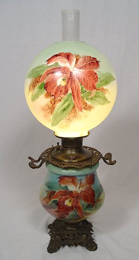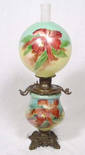 VICTORIAN GONE WITH THE WIND LAMP: Hand painted red orchid design, with ornate brass mounts. 30''h. overall with chimney. Electrified.