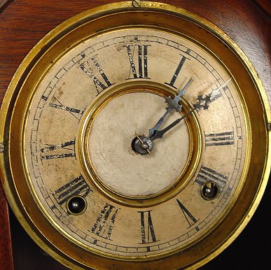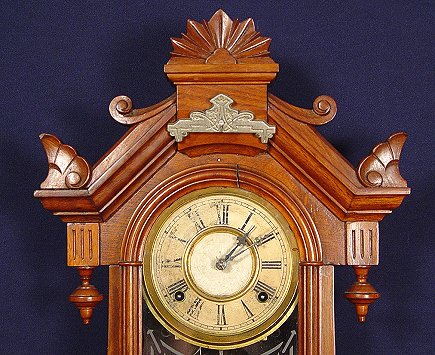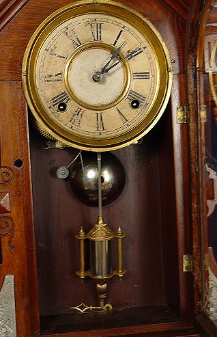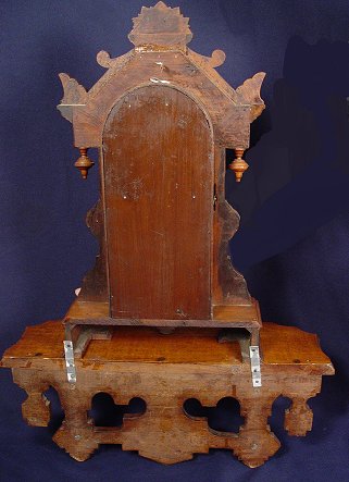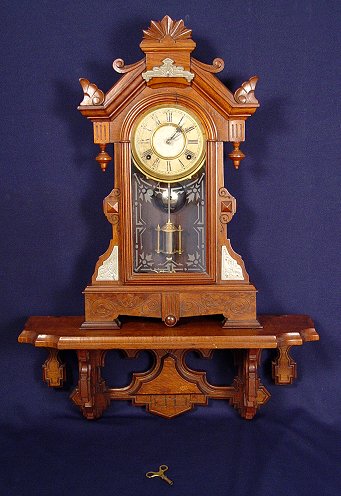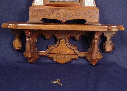 VICTORIAN SHELF CLOCK AND WALL BRACKET: Walnut clock with mercury (?) pendulum, bell strike, key wind. Matching walnut shelf, 24''l. The clock has unusual silvered metal adornments, 12''h.