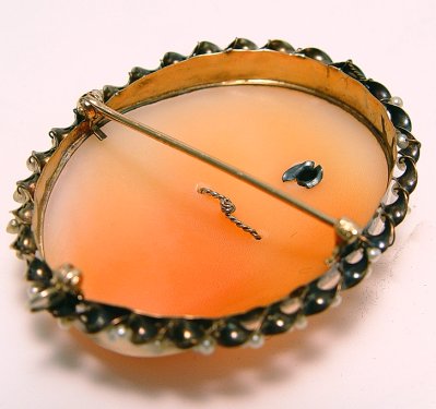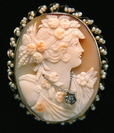 BEAUTIFUL CAMEO PENDANT BROOCH: Delicate soft shell cameo carved with Patrician lady, gold and diamond necklace around her neck, twisted ribbon and seed pearl decoration to outer edge, set in frame of 14k yellow gold. 2'' x 1 1/2'', clasp marked 14k, 13 grams.