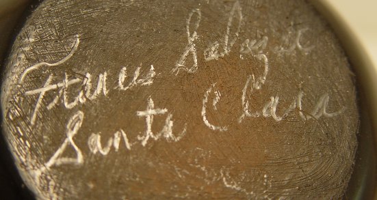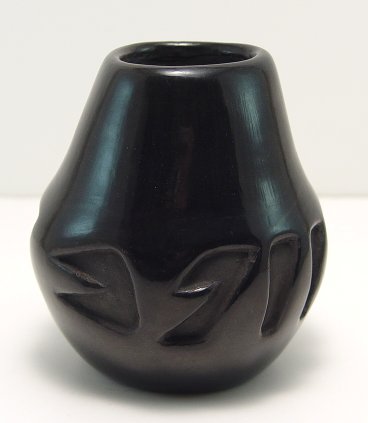 NATIVE AMERICAN SANTA CLARA POTTERY VASE: Pencil signed by artist Frances Salazar. Blackware vase with impressed design, 4 3/8''h. 5''dia. at the widest point. No chips or cracks.