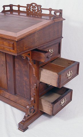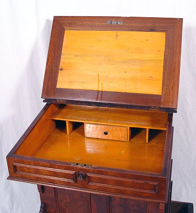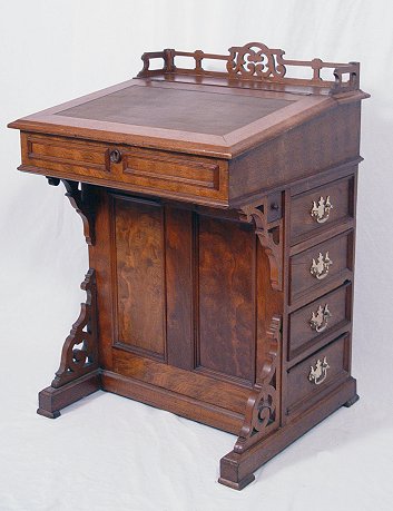 VICTORIAN WALNUT DAVENPORT DESK: Lift top surface with interior bird's eye maple drawer. Carved gallery, 3 drawers and a pen drawer on the right outer side. Heavily burled panels on the front. Minor restoration work done. 36''h. 25 1/2''w. x 23''.
