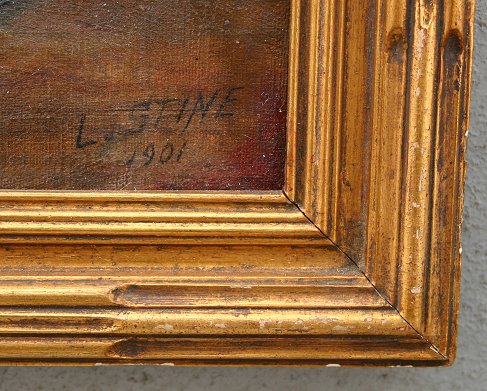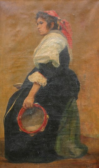 STINE, L., (European, 19/20th C.): Tambourine Girl, O/C, 25'' x 15'', SLR and dated 1901, encased in gold gilt carved frame with wear, 28'' x 18''. Condition - Relined with sporadic inpaint and several visible patch repairs.