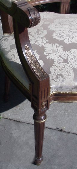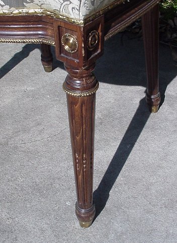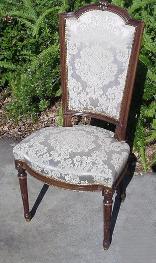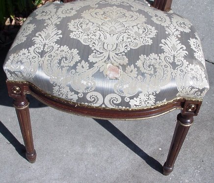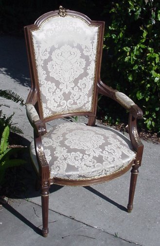 SET OF 10 FRENCH LOUIS VX STYLE ORMOLU DINING CHAIRS: 8 Side and 2 arm chairs. Top rails crested with ormolu scroll, fabric outlined in ormolu. Straight reeded legs. Excellent condition with slight wear to fabric of several seats. 44''h., seats are 22''w.