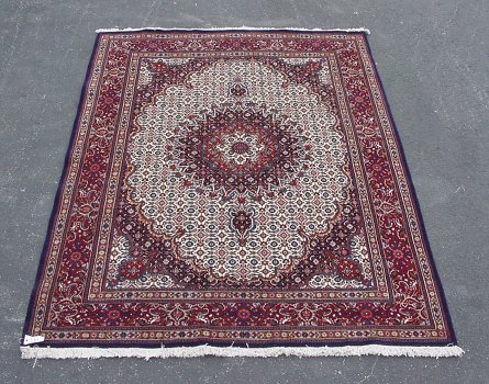 HAND TIED PERSIAN CARPET: Approx. 6'10'' x 9'3''. Central medallion, cream, dark blue and reds.