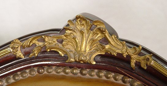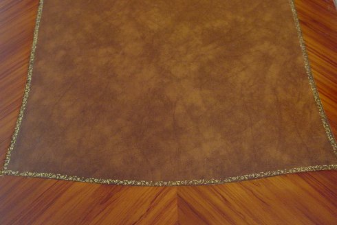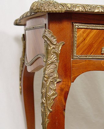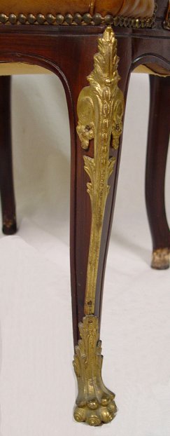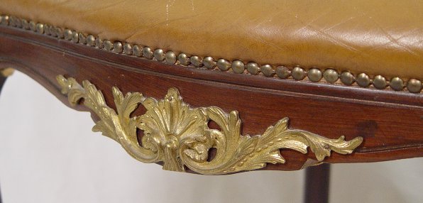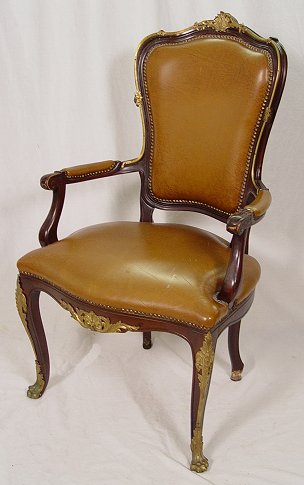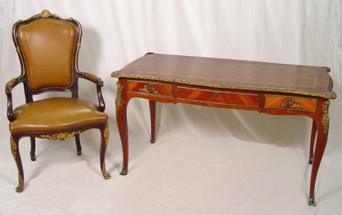 FRENCH ORMOLU DESK AND CHAIR: 3 drawer, leather top writing desk. Heavy with ormolu molding, edges and on the legs. The desk is 29 1/2''h. x 54''. x 27''. The matching arm chair has ormolu mounts, upholstered back and seat, 44''h, 25''w. x 22''deep.