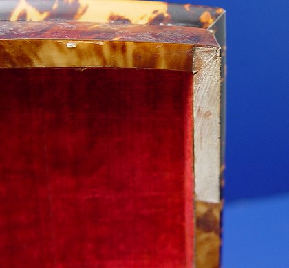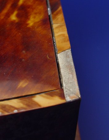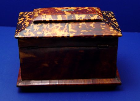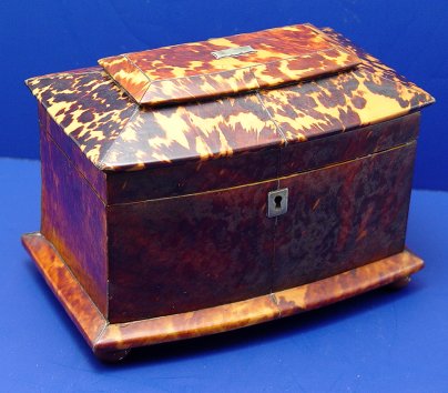 LARGE TORTOISE SHELL TEA CADDY BOX: Bowed front, tiered top. Double tortoise shell lidded interior. 5 1/2' x 7 1/2'' x 5''. Est. $2500/3000**