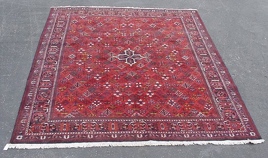 JOSHEGHAN HAND TIED CARPET: Approx. 10' x 13''. Red and blue coloration.