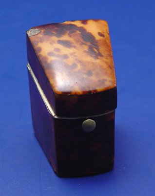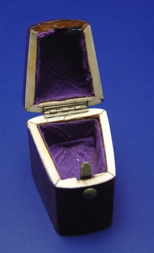 TORTOISE SHELL THIMBLE CASE: Wedged and angle shaped case with ivory rim edging. Hinged top. Chip to the upper corner, one piece of ivory edging missing. 2'' x 1 1/2'' x 1/2''.