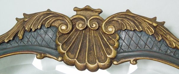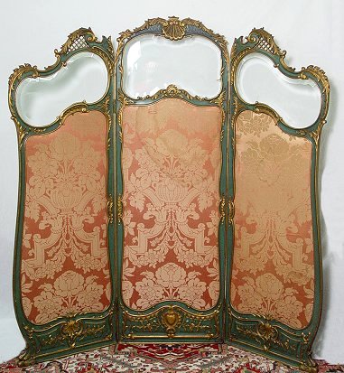 A MOST ELEGANT 3 PANEL FRENCH SCREEN: Carved painted and gilt wood frame with shaped and beveled glass panels to the upper section and upholstered lower sections. The middle panel is 67 1/2''h, the side panels are 65''h. 60'' wide overall.