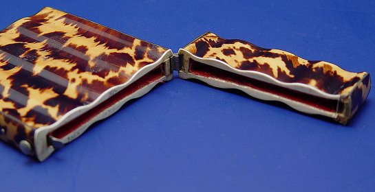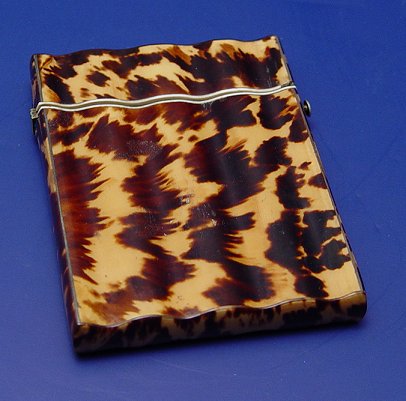TORTOISE SHELL CARD CASE: Hinged top case with serpentine body. ivory rim, 4 1/2'' x 3 1/16'' x 1/2''.