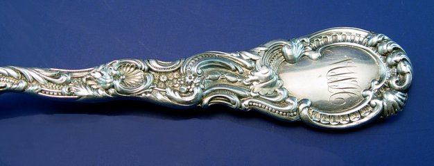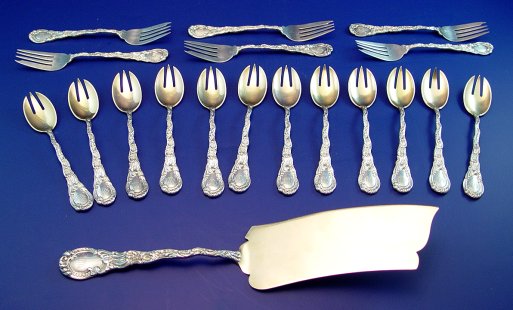DURGIN STERLING ''LOUIS XV'' ICE CREAM SET AND PASTRY FORKS: A 12'' ice cream slice or server, 12 ice cream forks, 5 3/4''l, and 6 pastry forks, 6 1/16''l. A rare and hard to capture set, this pattern was first introduced in 1891. The blade of the slice and bowl of the ice cream forks have a gold wash. All pieces monogrammed MHW. Durgin is now a division of Gorham.