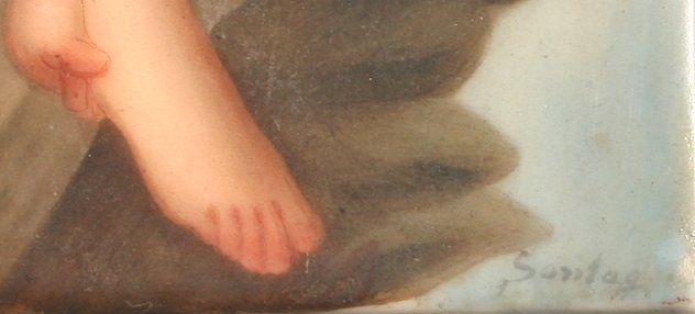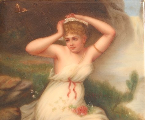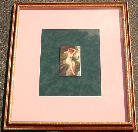 MINIATURE PAINTED GERMAN PORCELAIN PLAQUE: ''Alpenfee'' after Bernard, 6'' x 4'', signed lower right ''Sontag'', visible mark verso made in Germany, museum mounted in contemporary molding under glass, 26 1/2'' x 24 1/2'' overall.