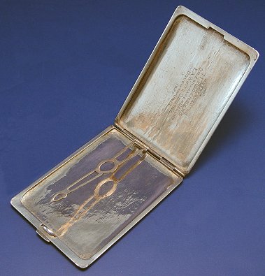 GENTLEMAN'S STERLING & 14K CARD HOLDER: Hand hammered case of sterling, front cover decorated with bands of 14k yellow gold, monogrammed I.I.R. to front, dedicated inside front ''Presented to I.I. Rosenberg Salesmanager Deluxe E.A White Org. Inc. Doughty Unit 1927'', pressure clasp with interior arm marked Sterling & 14K 332, 4 1/2'' x 3 1/8''.