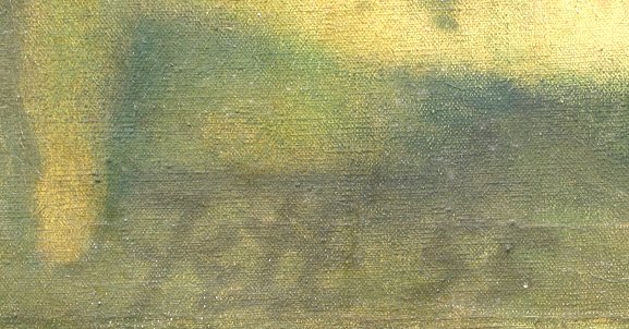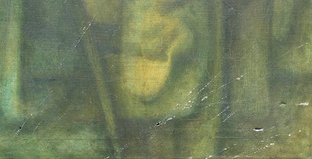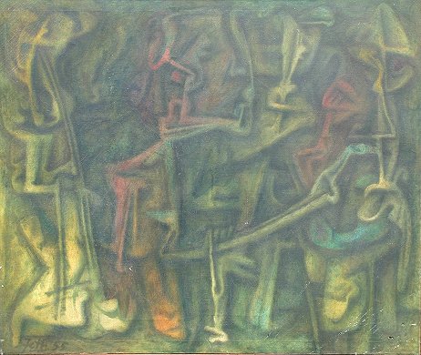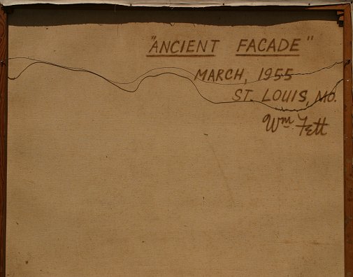 FETT, William Frederick, (American, 1918-): ''Ancient Facade'' O/C, 42'' x 50'', signed lower left and dated 1955, signed and titled verso. Condition - Scattered specs of paint loss, craquelure thoughout, several small punctures in lower right corner, needs cleaning.