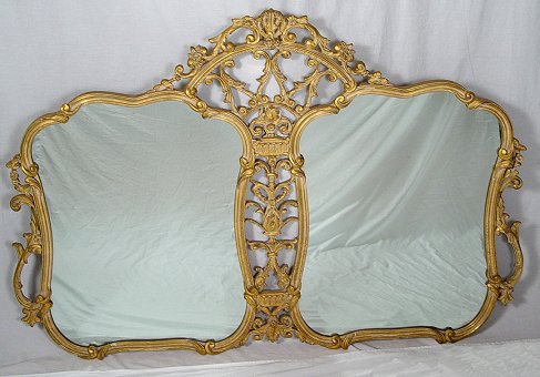 TWIN SIDED PARLOR MIRROR: Gold gilt frame with open scrolling decoration, each mirror approx. 32'' x 25'', 46'' x 65'' overall.