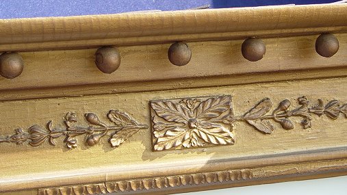 EARLY GILTWOOD AND EGLOMISE MIRROR: 2 part wall mirror with eglomise (gilt glass) scenic panel. Gold ball along the straight cornice. 47'' x 25 1/2'' overall. The looking glass is 29 1/2'' x 16 1/2''. Slightly worn condition.