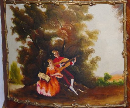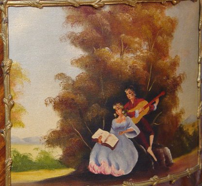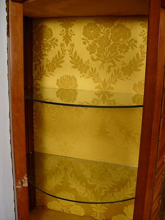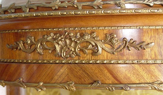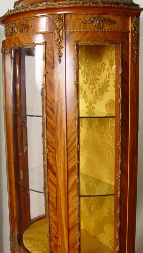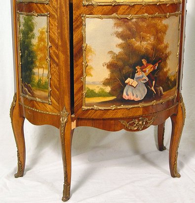 PAIR OF FRENCH STYLE ORMOLU CURIO CABINETS: Bowed front with painted panels framed in ormolu. Satin lined interior. 2 glass shelves, one satin covered shelf over hidden storage. Plexiglass panels in the doors. Made in Spain. 68 1/4''h. x 27''w, x 17'' deep.