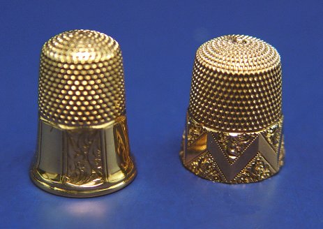TWO 14K YELLOW GOLD THIMBLES: Size 9 by Simons, zig zag paneled base with inner Vs embossed in scrolling pattern, not monogrammed, assayed 14k, S in shield mark to inner end. Size 7 with paneled base with every other one in a floral or scroll pattern, slight flare to base, not monogrammed, no mark found except for size, assayed 14k. Combined weight approx. 7.9 grams.