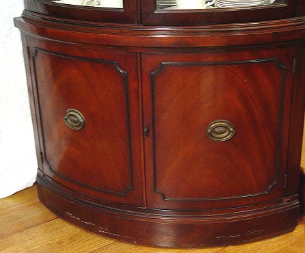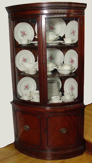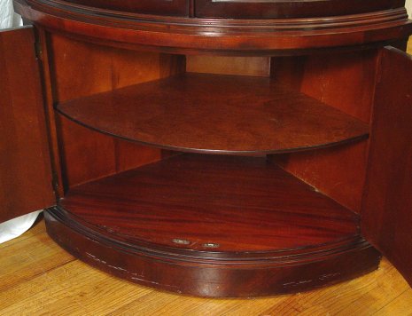 FINE DREXEL MAHOGANY CORNER CABINET FROM THE TRAVIS COURT COLLECTION: Bowed double glass doors over double doors. Molded cornice. Locks with key. Approx. 68 1/2''h, 35''w.
