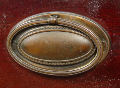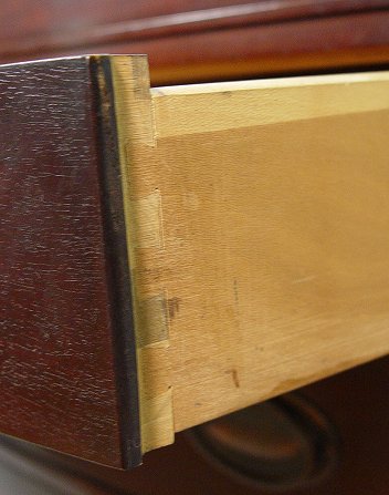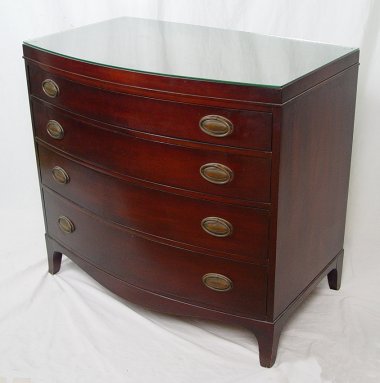 MAHOGANY BOW FRONT CHEST BY WHITE FURNITURE CO: Hepplewhite style 3 drawer chest. Custom glass top. Approx. 36''h, x 33'' x 22''.