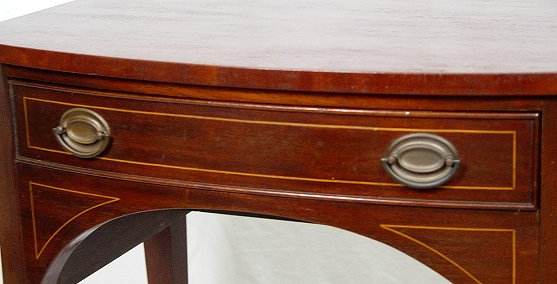 KITTINGER INLAY MAHOGANY ONE DRAWER STAND: Bowed front table with one drawer, string inlay and tapered legs. Kittinger label on the inside of drawer. Approx. 29 1/2''h, 27 1/2''w. x 18''.