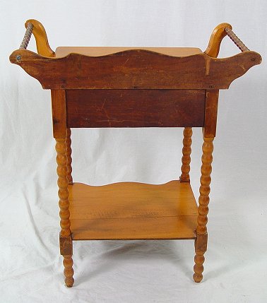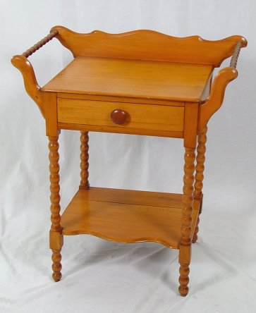 ONE DRAWER AMERICAN COUNTRY WASHSTAND: Pumpkin wood ?, one drawer stand with lower tier having a shaped front. Spool turned towel bars, shaped backsplash. 32 1/2''h, x 28'' overall.