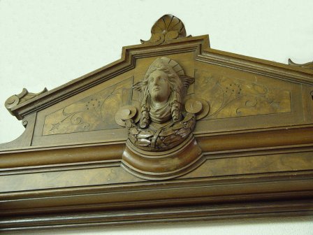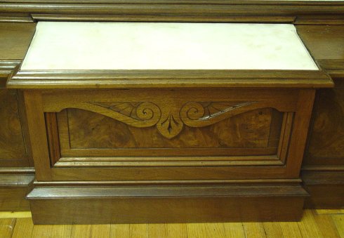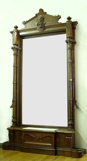 THE MOST GRAND VICTORIAN RENAISSANCE PIER MIRROR FRAME: 11 ft. tall walnut frame with carved masqueron and incised carvings. Under the marble inset is a deep drawer. 11'h, x 6'5'' overall.