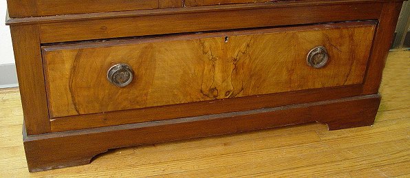 DOUBLE DOOR ENGLISH WALNUT WARDROBE: Mirror front doors separated by an inlaid and burl panel. Full length drawer across the bottom. 80''h x 48'' x 19''.