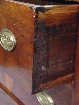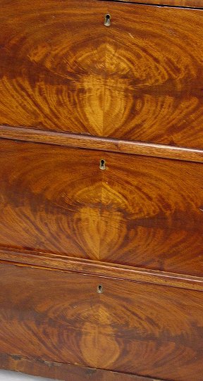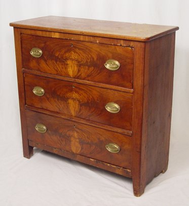 19th C VICTORIAN COTTAGE CHEST: Highly grained drawer fronts on three drawer chest. 37 3/4''h., x 39'' x 16 3/4''. Please note veneer chips above top drawer.