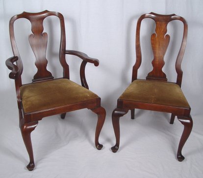 SET OF 6 HENKEL HARRIS CHERRY DINING CHAIRS: Queen Anne style 2 arm chairs, 4 side chairs. Henkel-Harris of Winchester Va., makers of reproduction 18th and 19th C antique furniture. Chairs are 39''h, seats are 22''w. Paper label.