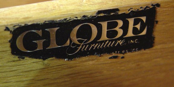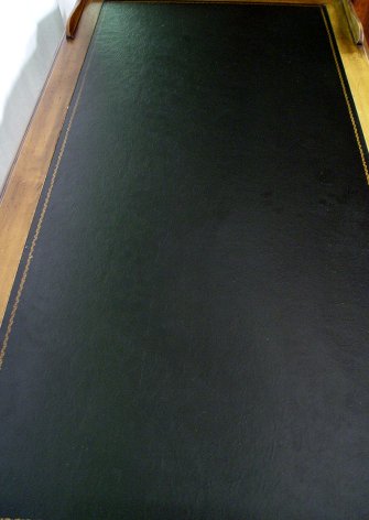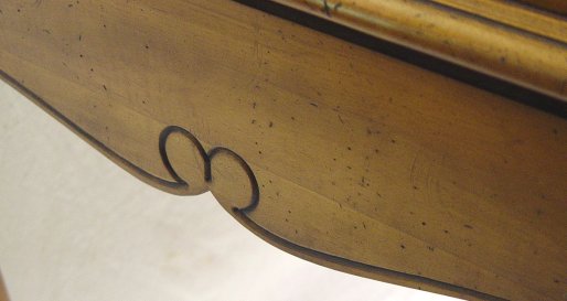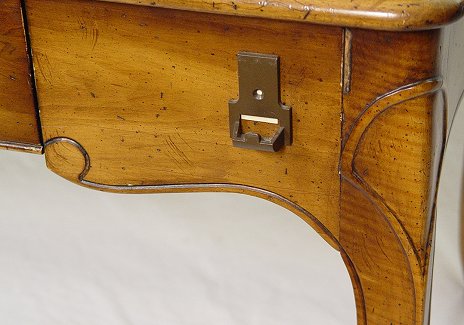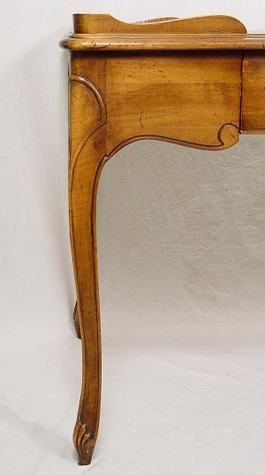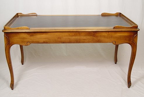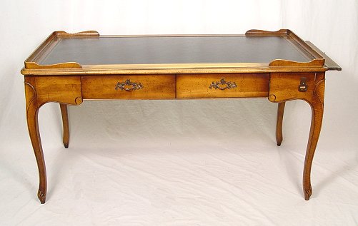 FRENCH STYLE LEATHER TOP WRITING DESK: By Globe Furniture Co. Warm patina yew wood with black leather surface. 2 drawers, a slide out surface along the right edge, a space for a slide on the other. 31 3/4''h, including gallery, 59''w, 29 1/2''deep.