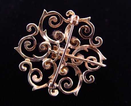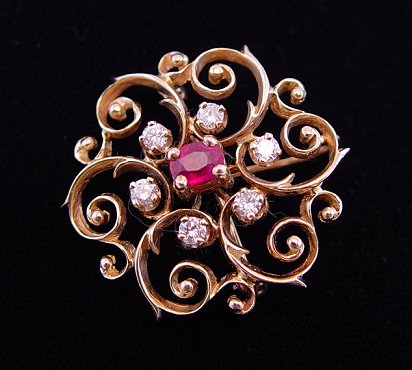 LOVELY ANTIQUE STYLE BROOCH: Scrolling open work of 14k yellow gold centered by an approx. 1/2ct oval cut ruby, surrounded by ring of 6 small diamonds, approx. 40pts total. Straight pin finding and pendant loop, approx. 1 1/8''dia., 6 grams.