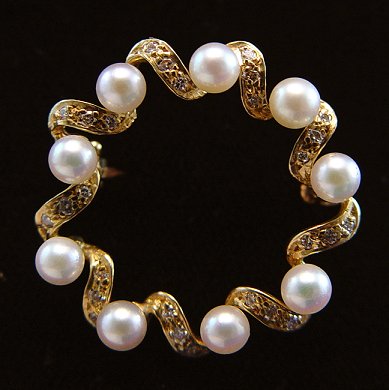 PEARL & DIAMOND CIRCLE BROOCH: Twisting ribbon of 14k yellow gold set with set with tiny diamonds and 3.5mm cultured pearls. 7/8''dia., 3.6 grams, marked 585.