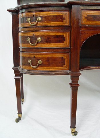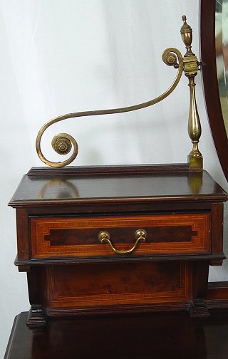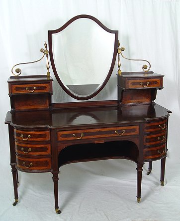 THE MATCHING BANDED MAHOGANY VANITY: Shield shaped beveled mirror swings between brass supports. Exagerated round corners of three drawers centers full length drawer. 63 1/2'', x 56 1/2'' x 24''. Est. $800/1200**