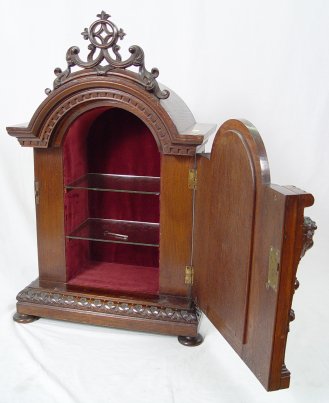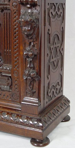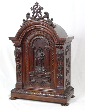 SECRET CARVED OAK CABINET: 34''h. Arched top cabinet with carved crest. Carved door panel showing Saint carrying a large cross, side panel has relief carving of Star of David. Secret drawer. Bun feet. 21''w. x 11''. Est. $1200/1400**