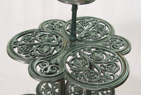 CAST IRON VICTORIAN GARDEN PLANT STAND: Two graduated tiers of circular discs. A later, but not new, green painted finish. 73 1/2''h, 30''dia. at the widest point.