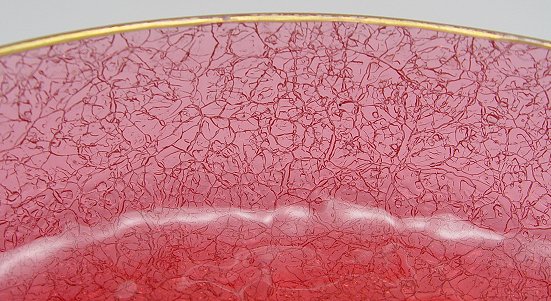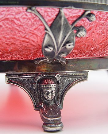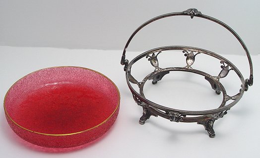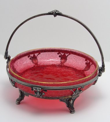 REED & BARTON VICTORIAN SILVERPLATE BASKET WITH CRANBERRY OVERSHOT BOWL: 8 1/2'' diam. cranberry overshot glass bowl sits in an ornate silverplated holder with Egyptian masquerons on the curved feet. The handle is adorned with grapes and leaves. Basket is 3''h, excluding handle.