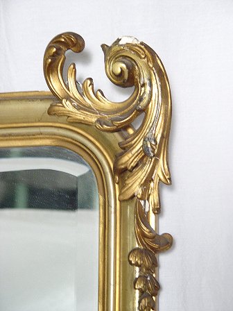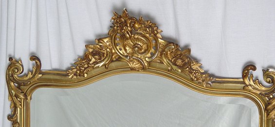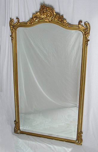 6.5 FT. TALL CARVED AND GILT WOOD ROCOCO MIRROR: Beveled mirror in a wonderful floral and scroll carved frame. 78'' x 41'' overall, the looking glass is 65 1/2''h. with arched top, x 35''w. Please call for condition.