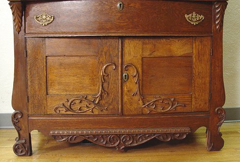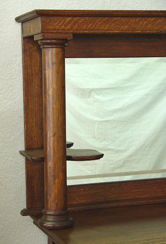TURN OF THE CENTURY OAK SIDEBOARD WITH MIRRORED BACKBOARD: Beveled mirror with columnar supports. 2 half length drawers over full length drawer over cabinet doors. Applied carvings. 64 3/4''h. x 45''w. x 23''deep.