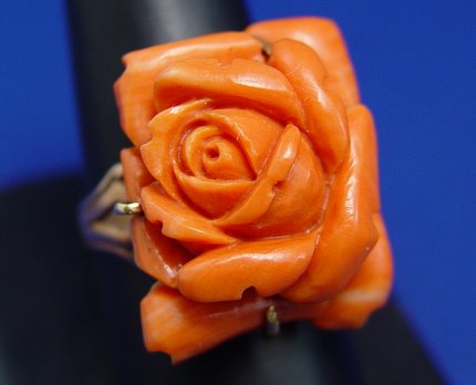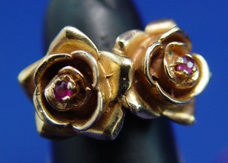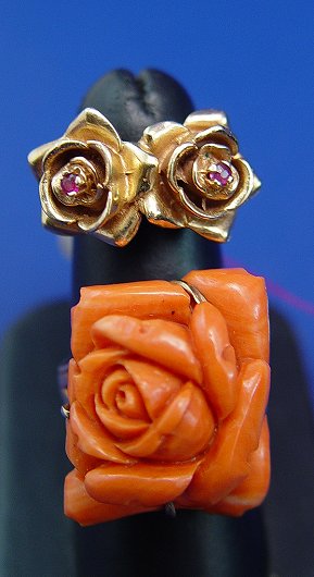 PAIR OF ROSE RINGS: First an impressive coral carving of a rose set on Victorian mount of 10k rose gold, size 9.5. Sold with a double rose ring of 14k yellow gold, each rose centered by a tiny full cut ruby, marked 14KATL 14k, size 5.5, 7.9 grams.