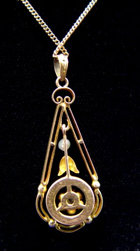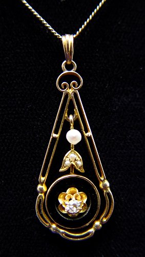 LOVELY VICTORIAN LAVALIER NECKLACE: Delicate open work pendant, 1 7/16''l. x 9/16''w., of yellow gold with inner drop set with seed pearls and a small diamond in a ring of onyx. Assays 10 and 14k, hasp marked 10k, on a 15 1/2''l. chain marked 10k.