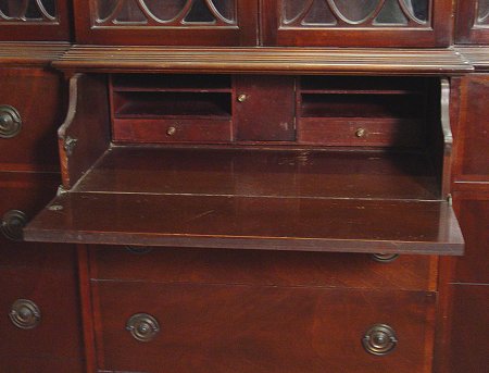 MAHOGANY SECRETARY BOOKCASE: Featuring carved dentil molding, latticed glass front doors and banded drawer fronts. The lower section has desk over drawers. The side drawers are actually doors with file trays and shelves . Approx. 6'6''h, 44''w. and 14'' deep.